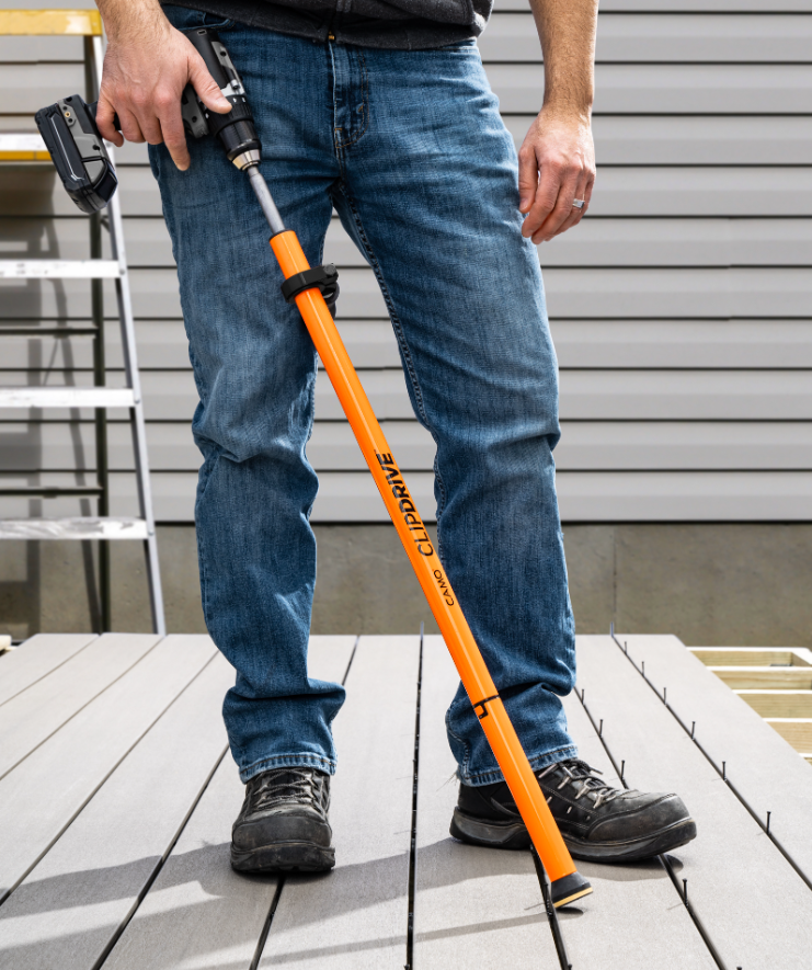 The ClipDRIVE tool allows contractors to fasten grooved deck boards while standing, improving comfort and jobsite efficiency.